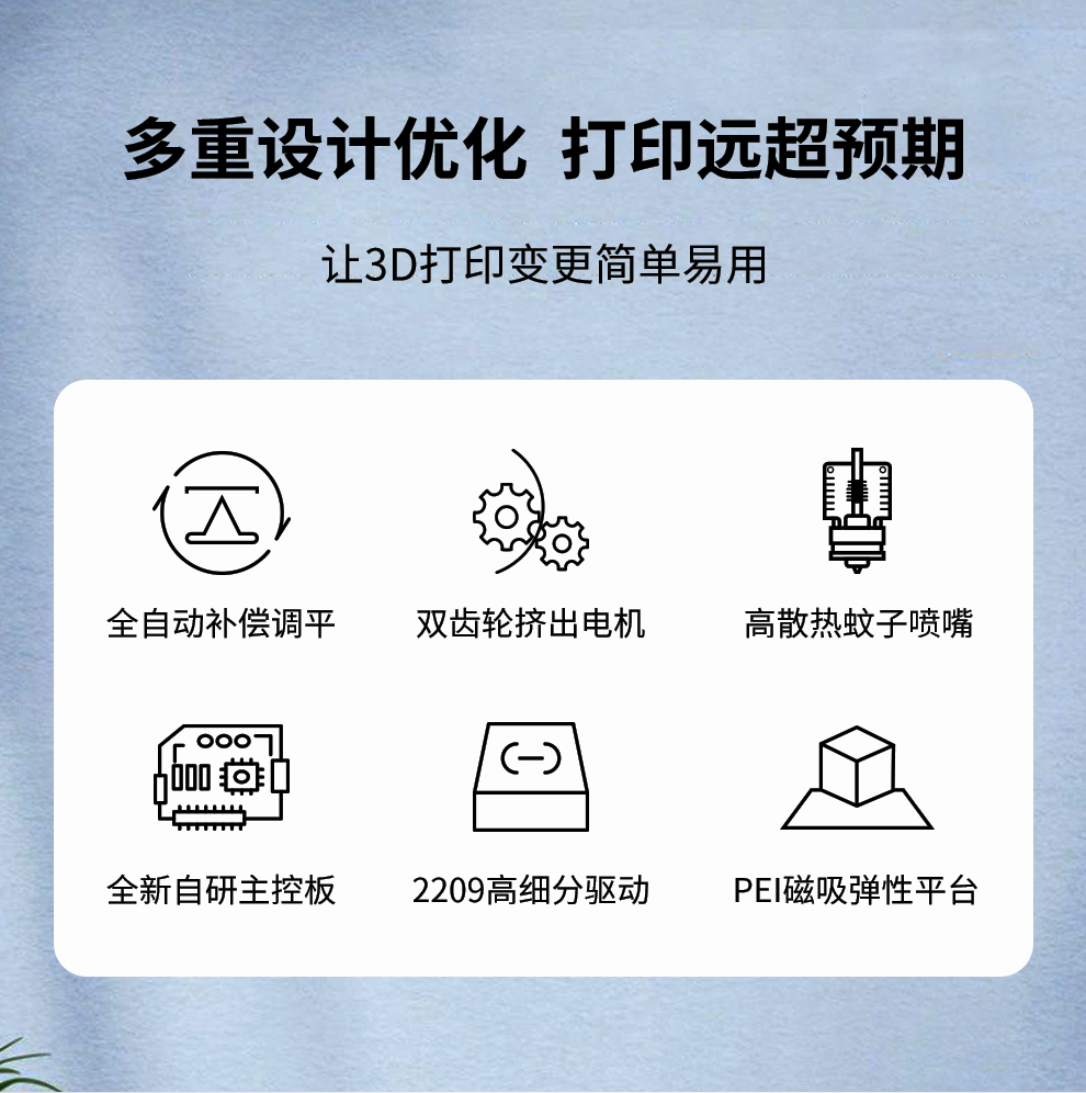 先进热感控制系统,四轴静音驱动主板,搭载静音风扇,你可以享受到安静无噪音的打印环境,同时为机体及时冷却散热,有效避免模型过热变形等问题。