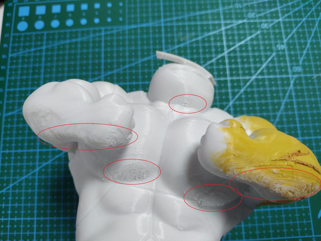 当然这并不是没有代价的,这将会导致接触面的打印效果变得糟糕,线材会因为大距离而下落,尤其是重力方向上的接触面,如下图所示。