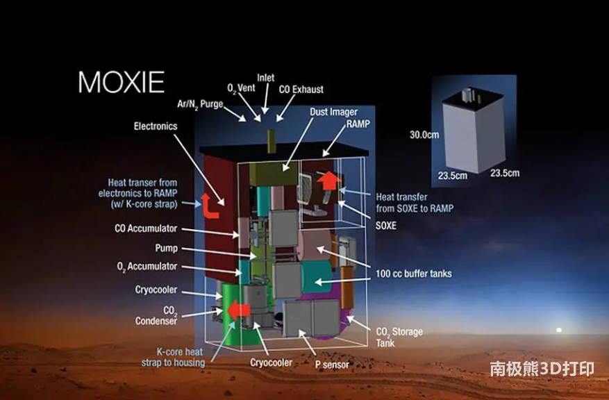 "毅力号 "火星车的其他6个3D打印部件在 "火星氧气原位资源利用实验 "仪器中,简称MOXIE。这个设备将测试新的技术,未来可以生产工业数量的氧气,在火星上制造火箭推进剂,帮助宇航员发射回地球。