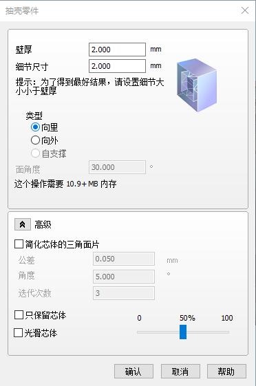 “向里”自然就是模型内部掏空,“向外”则是在模型外面包一层壳,用于制作模具等情况。