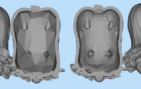 基本上所有光固化切片软件都支持掏空功能,不过不同软件掏空算法可能有区别,掏空的内部形状不一样。如图,左侧是赤兔软件掏空的内部情况,而右侧则是用magics来掏空的。可以对比发现,总体上掏空内容差不多,但magics掏空后内表面更加简化光滑。更简洁的内表面意味着三角面更少,切片过程更快,减少电脑运行压力,这个对于大量中间模型切片时效用很大。同时也因为较少出现复杂内表面,减轻了内部清理的难度。