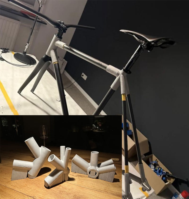 了解到,这辆自行车采用了碳纤维管+3D打印铝制连接件的形式拼装而成。他们在车头、底架、车座和后下叉周围使用了3D打印铝制连接件,并将碳纤维管连接在一起。