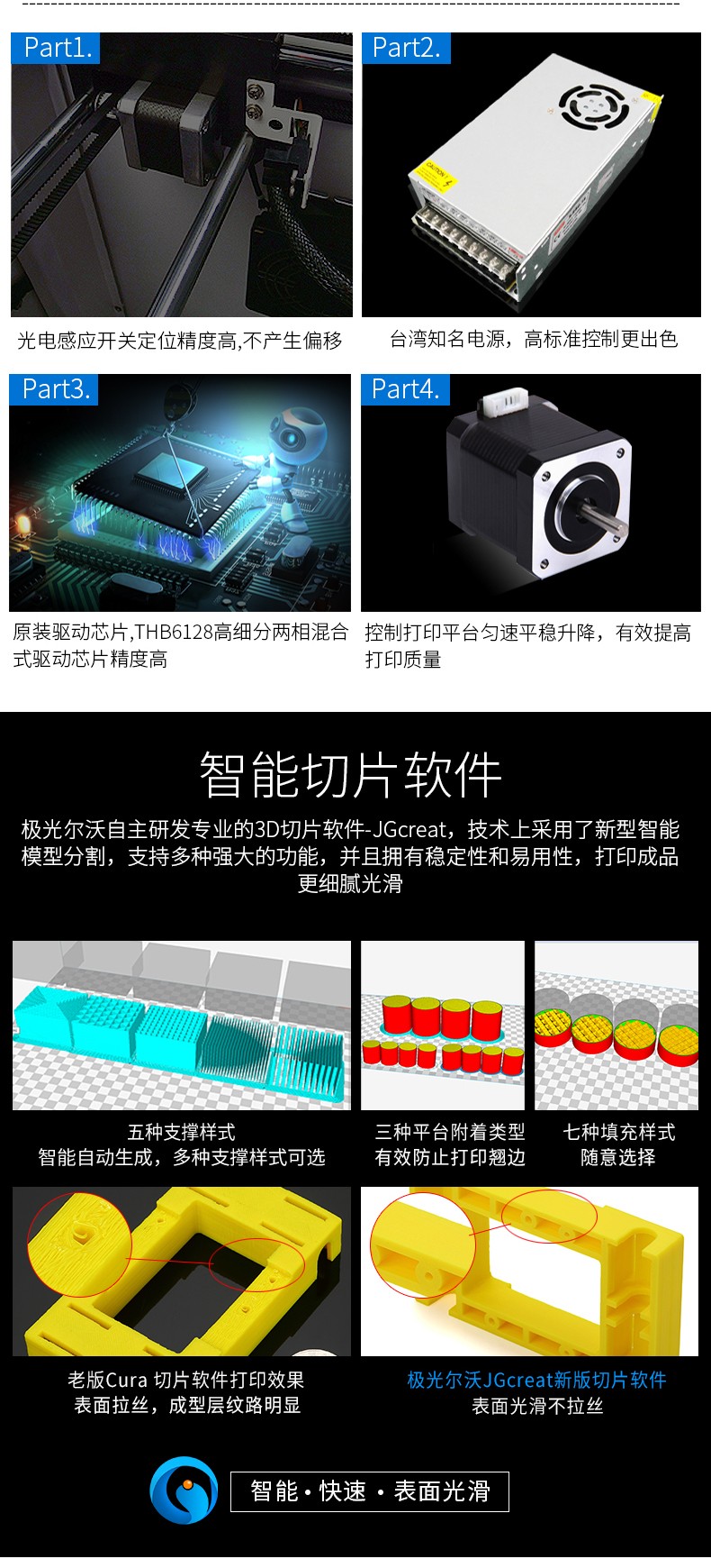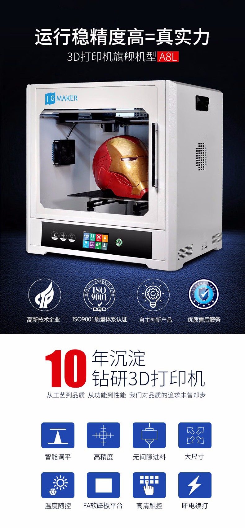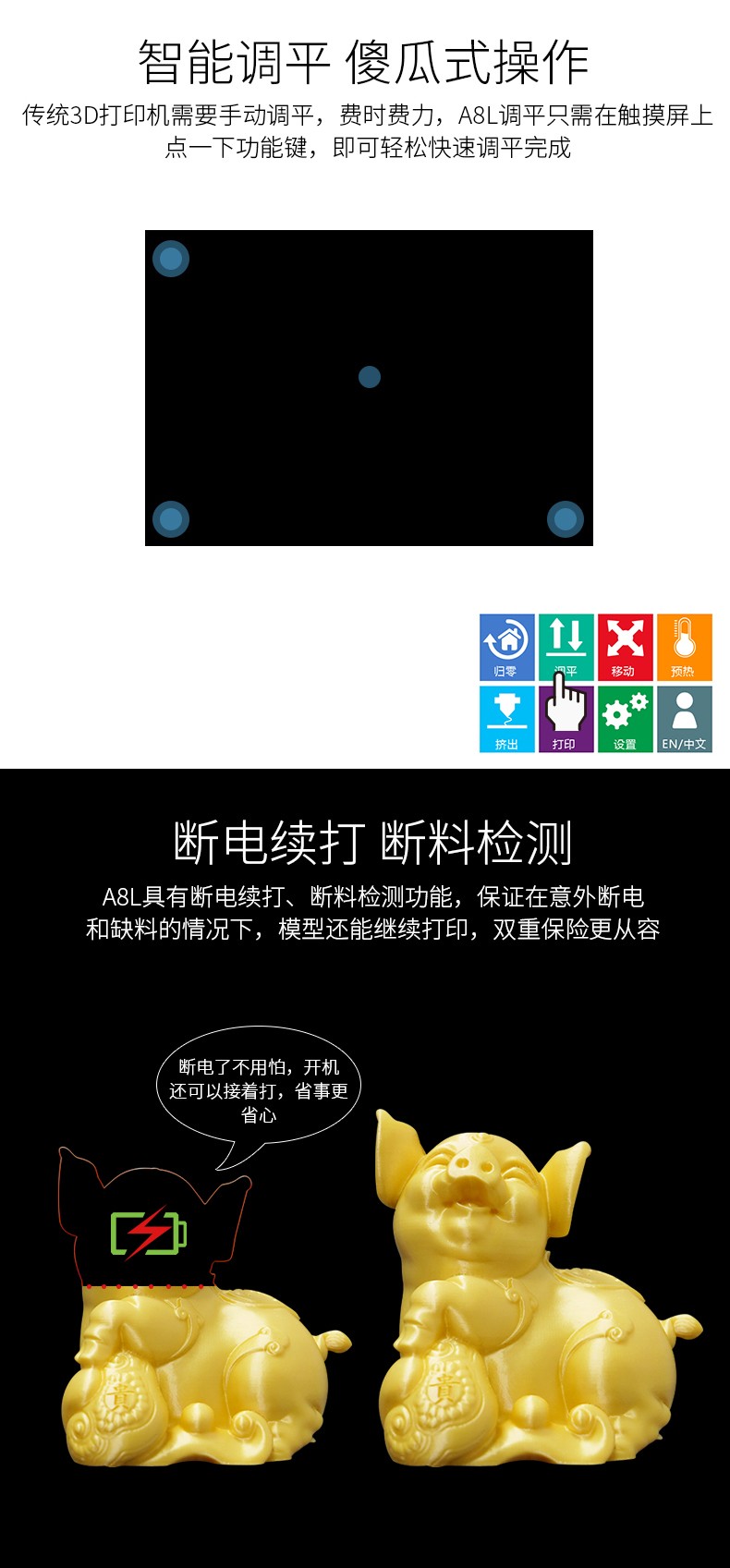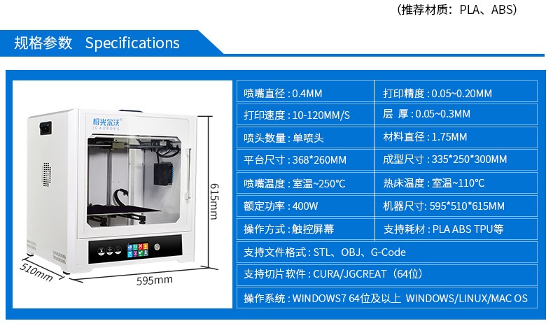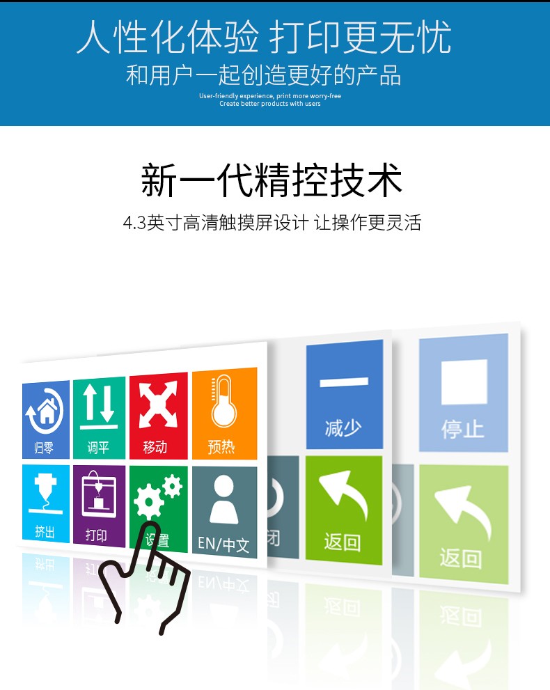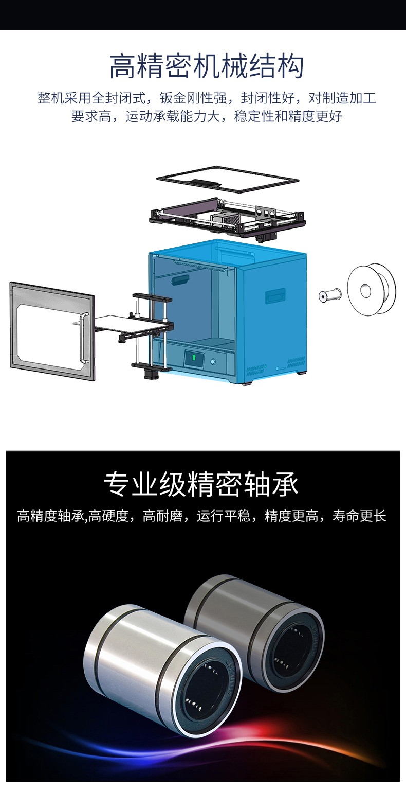 4.3英寸电容触摸屏,清晰美观,操作简单;FA特制平台,打印完成可取下平台,轻松取模;??榛惶迨椒獗丈杓?,提高模型打印成功率;内置空气过滤系统,有效滤除打印过程中产生的颗粒;具有暂停续打、断电续打及断料检测等功能;高精度,大尺寸打印,可应对各种结构复杂的手办模型